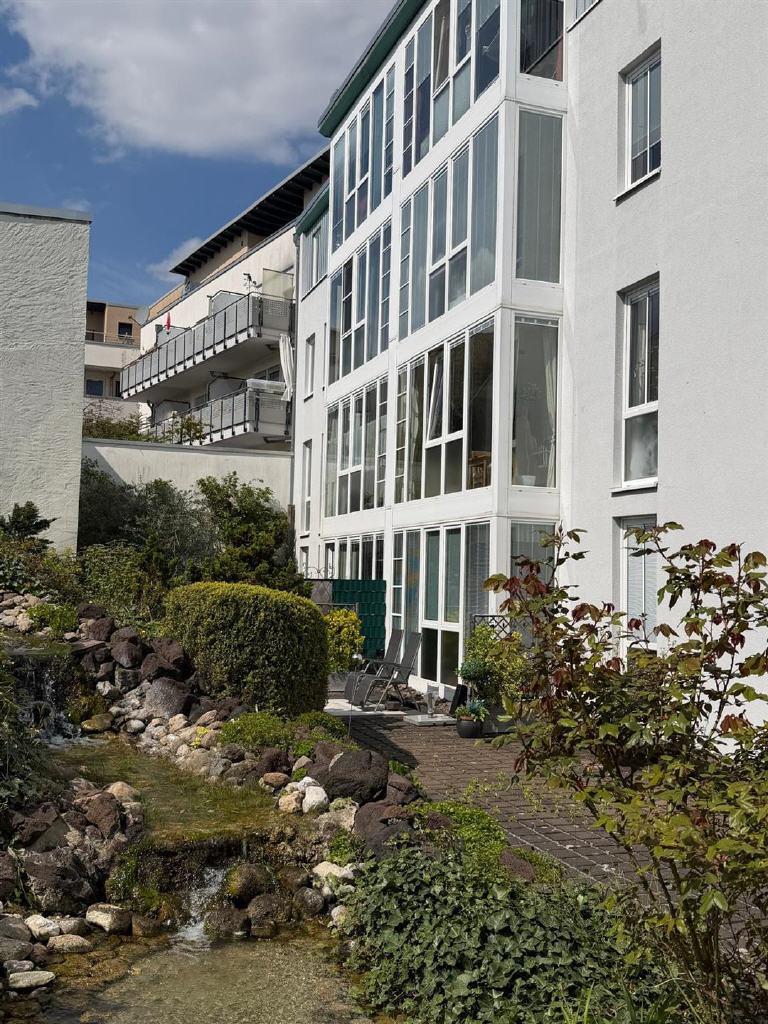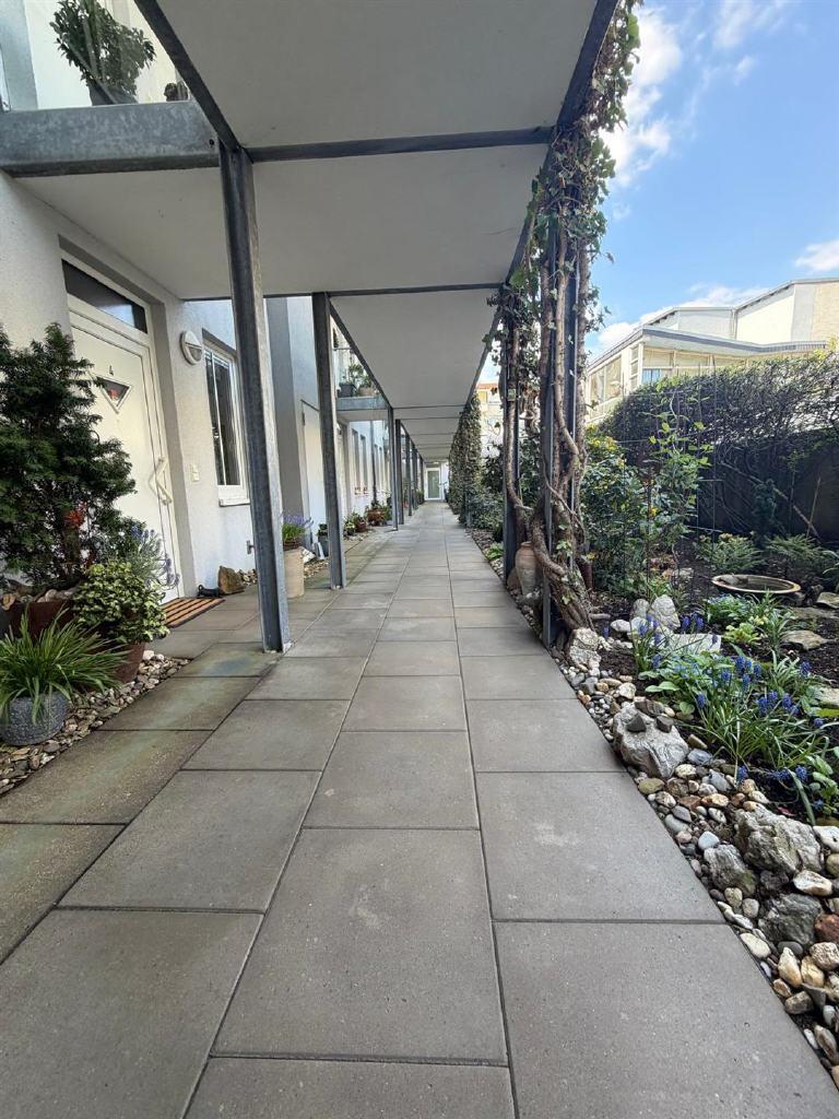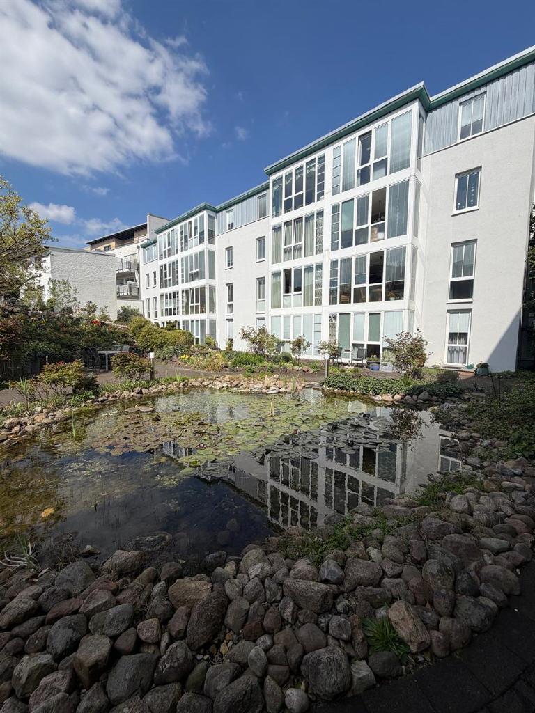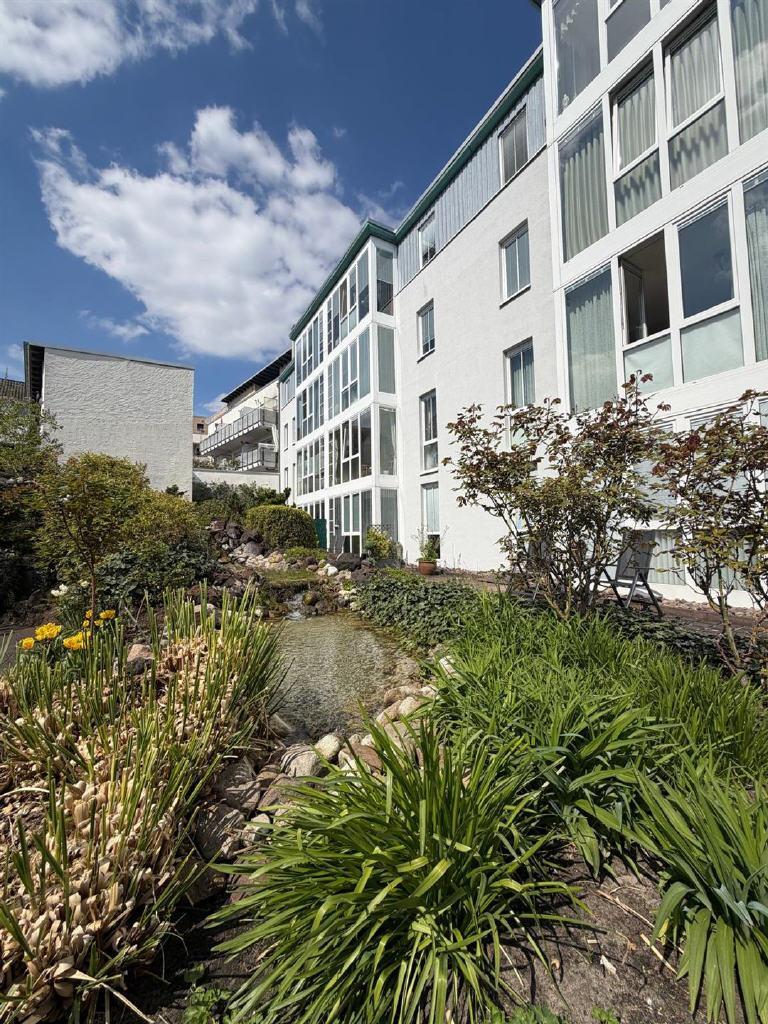Begrünte Laubengänge sowie eine liebevoll angelegte Gartenanlage mit Teich und Wasserlauf im Innenhof schaffen ein angenehmes und geschütztes Wohnumfeld.